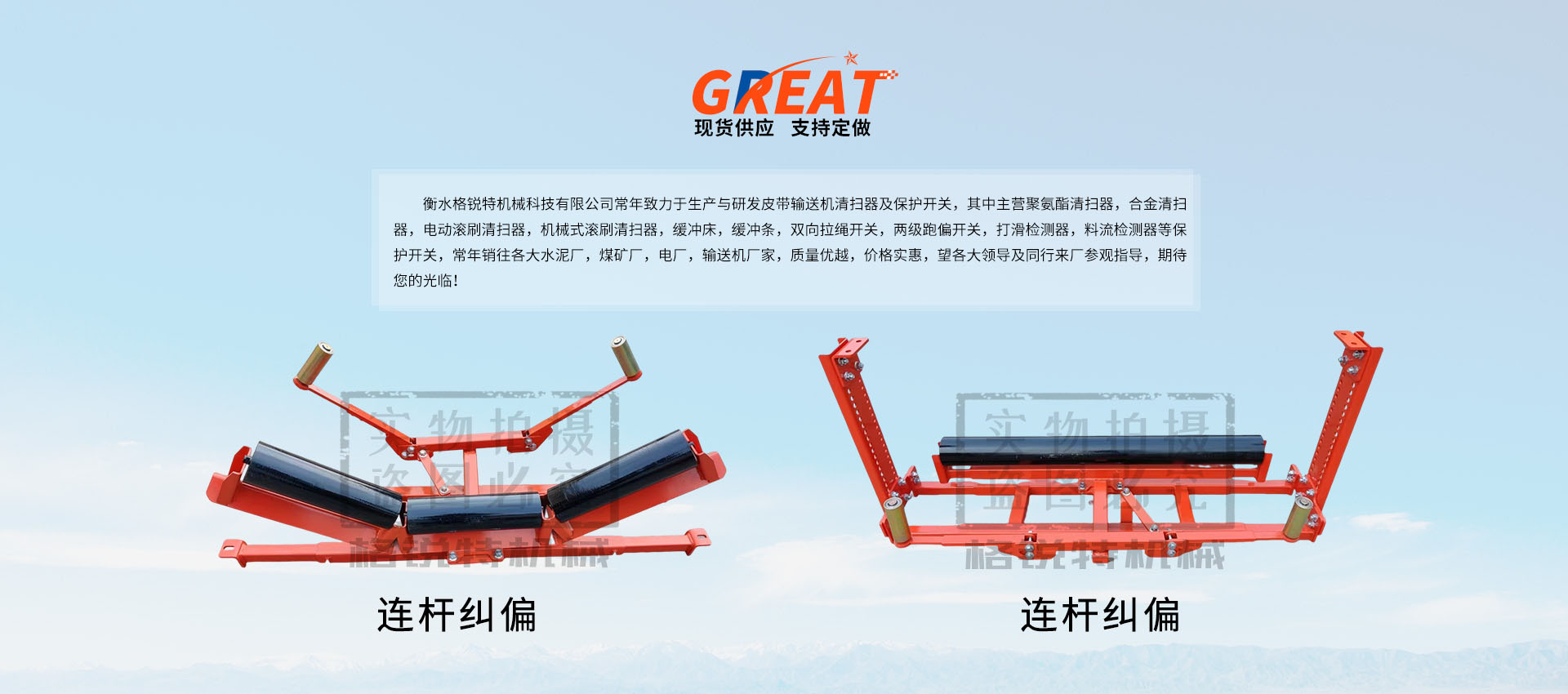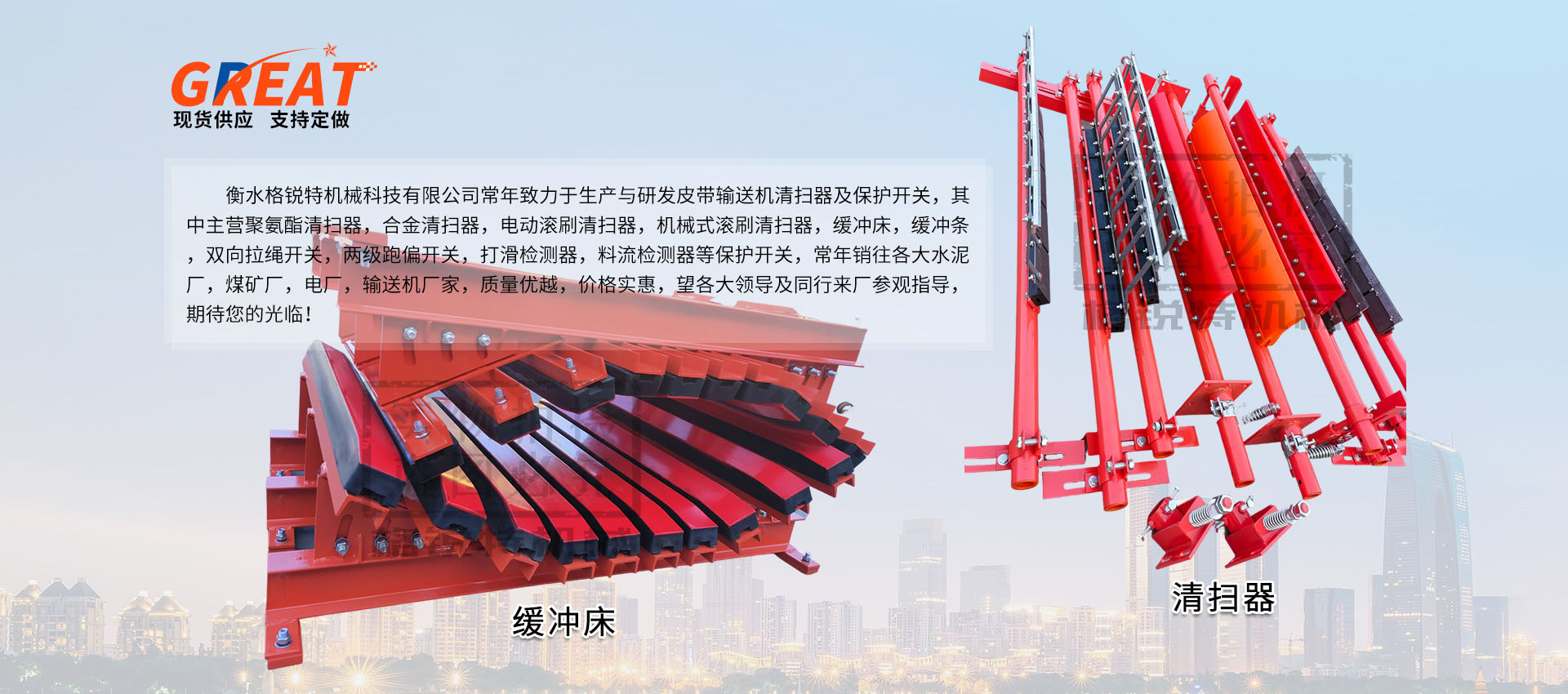 衡水格銳特機械科技有限公司常年致力于生產與研發(fā)皮帶輸送機清掃器及保護開關,其中主營聚氨酯清掃器,合金清掃器,電動滾刷清掃器,機械式滾刷清掃器,緩沖床,緩沖條,雙向拉繩開關,兩級跑偏開關,打滑檢測器,料流檢測器等保護開關,常年銷往各大水泥廠,煤礦廠,電廠,輸送機廠家,質量優(yōu)越,價格實惠,望各大領導及同行來廠參觀指導,期待您的光臨!!!